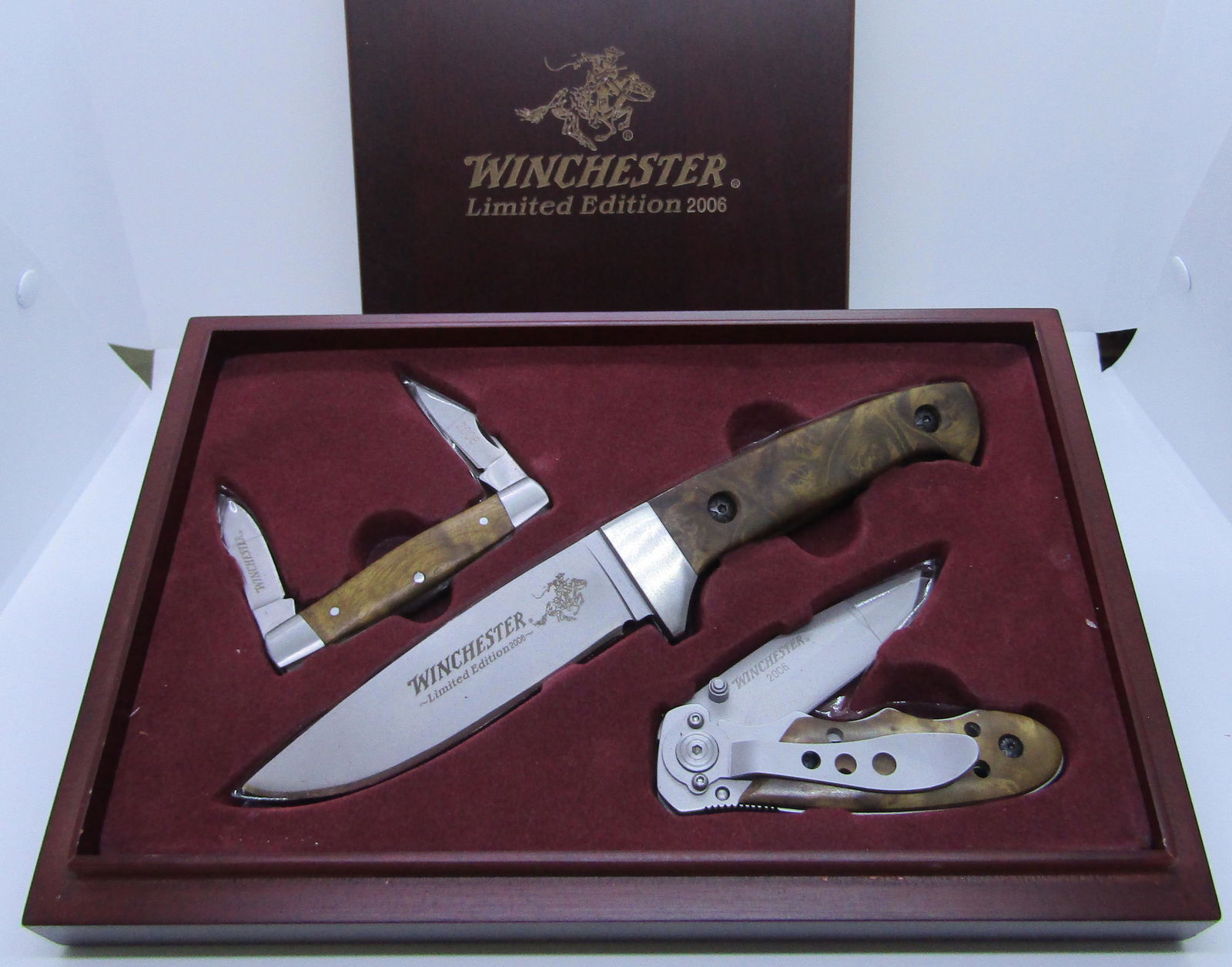 The winchester 3 folder serrated is a handy pocket knife that can be opened with one hand, both left and right. 2007 edition winchester 3 piece knife set : 2007 winchester limited edition knife set. $26.99 winchester limited edition 2009 wood handle knife 3piece set. 5 ¾ open and 3 3/8 closed. Winchester 200th commemorative with a collectable set of signature series knifes. Winchester 2007 limited edition wildlife series ersatz scrimsaw 3 13.03.2013 · viewwinchester 3 knife setwinchester 3 knife setknife set | brand : Checkered wood handles provide extra grip. 0 s p p l o n s o m d o 8 r e r w d 2 l. Winchester 4 piece lot knife& tool stainless set multi tool pocket knives. Two piece wooden display box. Edition on the blades, one has a stainless belt clip w/ cut out w if you arrange your own freight we will not accept responsibility for goods once they have been collected by a third party. 2007 edition winchester 3 piece knife set :